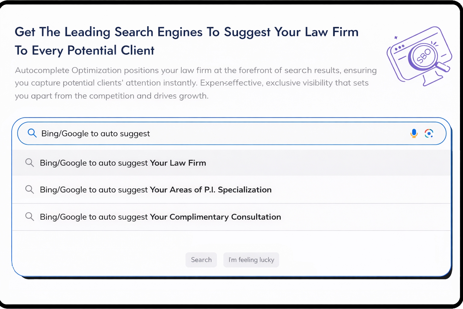 Searching Personal Injury Clients will see your Law Firm suggested before they ever have a chance to see your competition. Get to clients first with Autocomplete-Optimization.